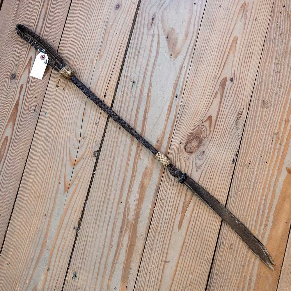 31″ black braided rawhide quirt with natural rawhide accents. Has braided rawhide wrist strap and leather poppers.
