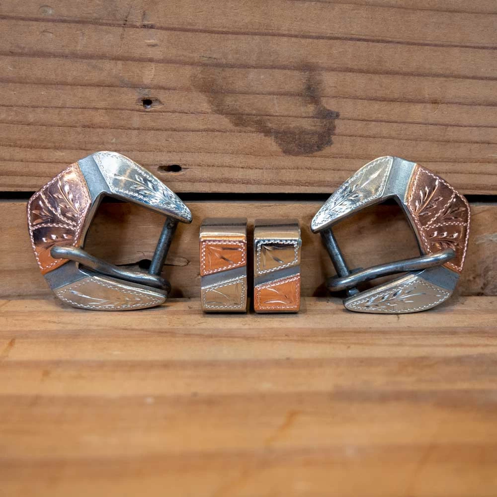 Copper and gold mounted 3/4″ Josh Owney buckles.