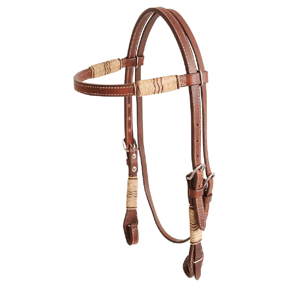 Cashel rawhide trim headstall is chocolate skirting leather with two rawhide accents on browband, double stainless steel buckles and quick change bit ends.