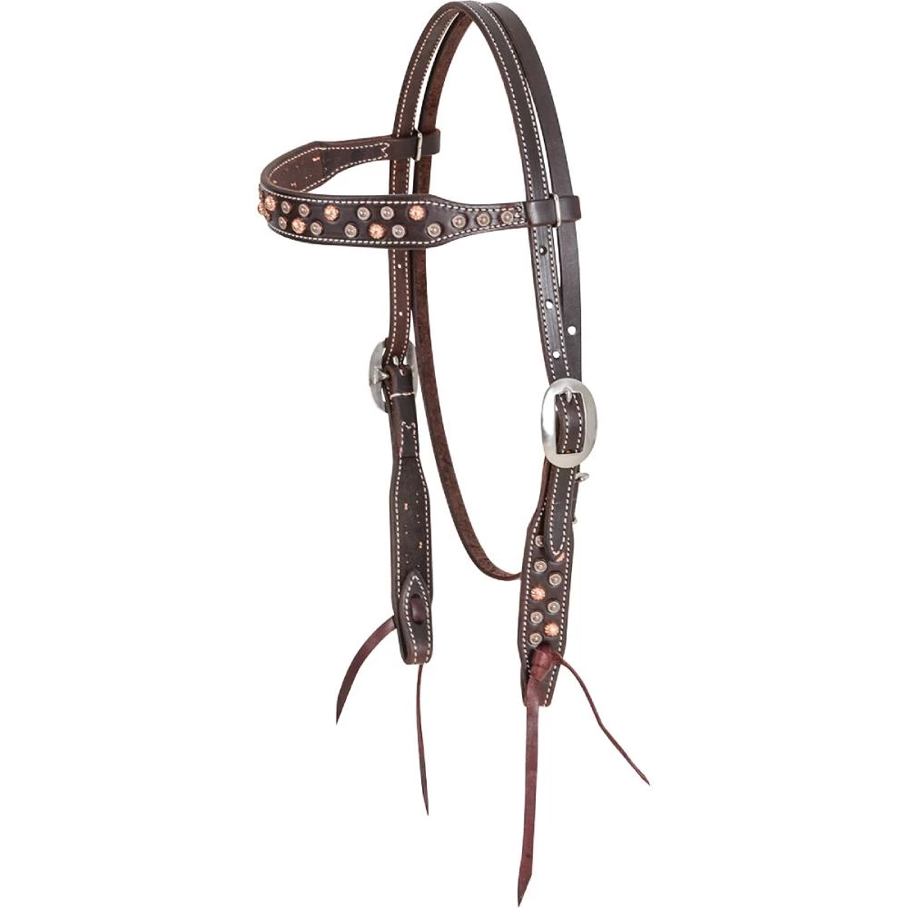 Chocolate skirting leather with copper parachute dots and antiqued dots.