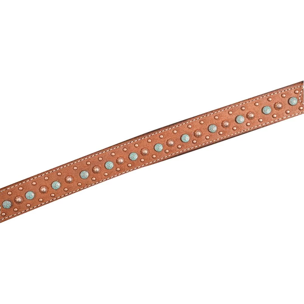Roughout leather with embossed floral spots and nickel oxidized dots. 1-1/2″ Wide.