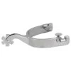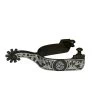 1-3/4″ shank length with 1″ rowel and 3/4″ band width. Features stainless steel floral trims, copper accent and chap guard. Antique finish, level two. Medium.