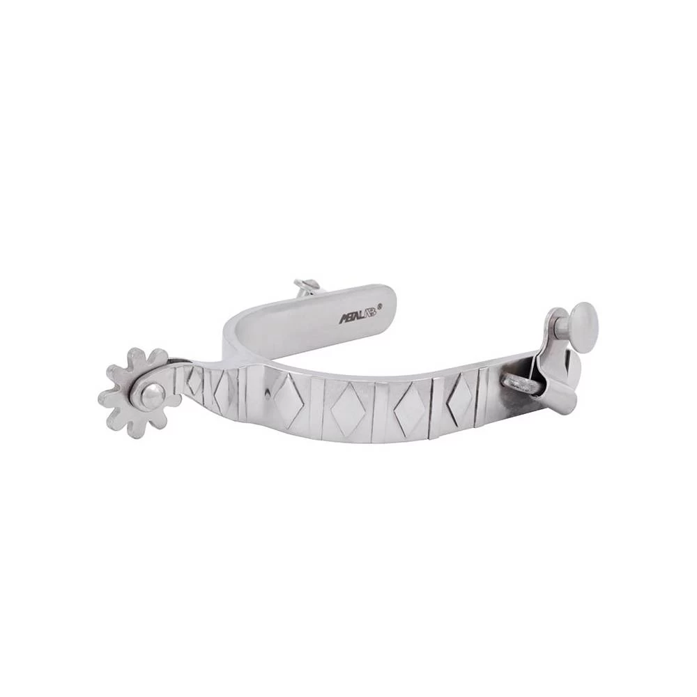 1-1/2″ shank length with a 1″ 9 point rowel and 3/4″ band width. Features stainless steel diamond trim with stainless steel brushed finish. Level two.