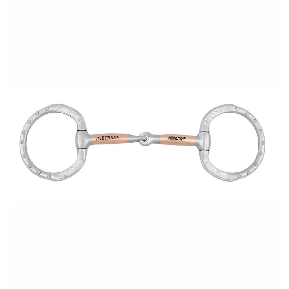 Smooth Copper Covered Snaffle Mouthpiece with Engraved Silver Details on Rings. Brushed Stainless Steel Finish.