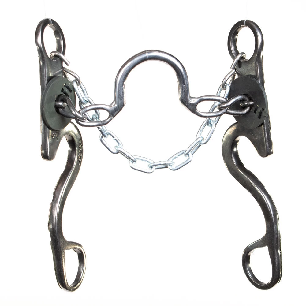 Patrick Smith chain high port bit and chain curb. Shorter shank with engraved silver plates on cheeks.