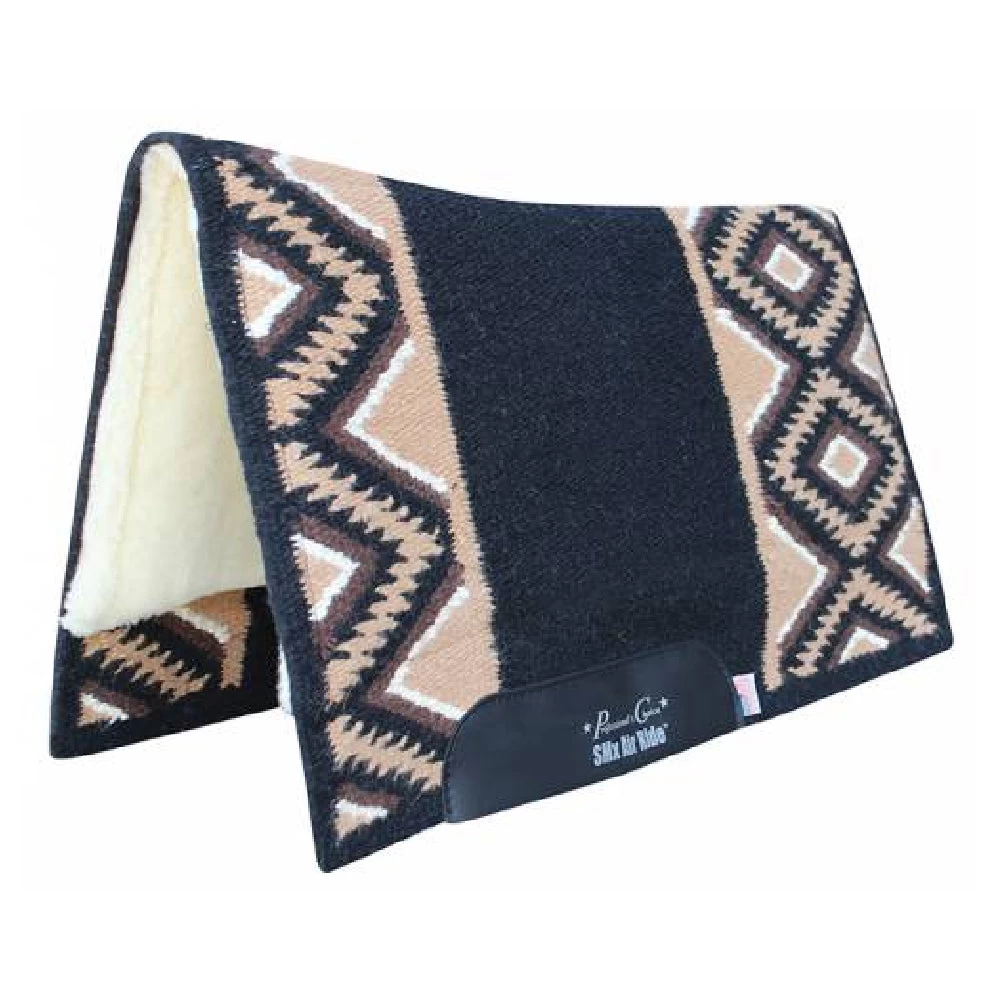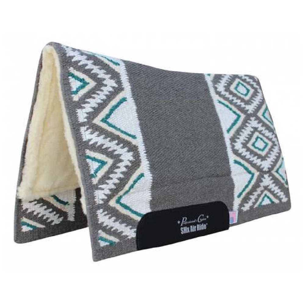 Developed from the horses back up, the Comfort-Fit SMx Air Ride Saddle Pad is contoured to follow the curve of the horses spine. As a result, the pad locks in place on the horses back, allowing full movement. The 3/4 ” SMx Air Ride core is made of a unique material found in the protective gear of professional human athletes for absorbing shock while allowing air flow to the skin, the SMx Air Ride cores natural cooling system lowers the horses body temperature and slows the rate of fatigue. A natural felt bottom absorbs sweat and provides additional grip on the horse