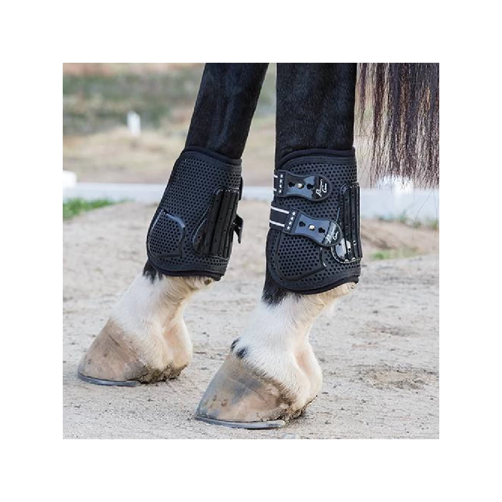 These new Show Jump boots are a hybrid of our current Pro Performance XC boots and Pro Performance Show Jump boots. These boots are made of the same great technologies found in the Pro Performance XC boots: Pro Mesh material and an updated Pebax strike guard. The Pro Mesh material is composed of a TPU that is directly injected into a breathable mesh fabric. This no glue, no lamination, and no stitching process creates an unbreakable bond. The result is a rip-stop, breathable material that easily conforms to your horse’s leg and will not absorb water. An updated Pebax strike guard is now contoured to fit the natural curve of your horse’s leg. The Pebax strike guard is flexible, but stiffens upon impact for protection. These new Show Jump boots are available in Front and Rear pairs with either hook and loop closures or TPU fastener closures. One Size. Sold in Pairs.