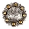 Silver square concho with copper wire border and gold flower, accented with silver flower center and scroll bordering. Available in 1″ and 1 1/2″