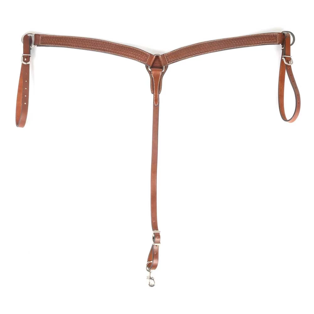Teskey’s 1-1/2″ Leather Breast Collar with Basketweave & Shell Border. White stitching around the outside with brown edging. Available in Chestnut or Light Oil.