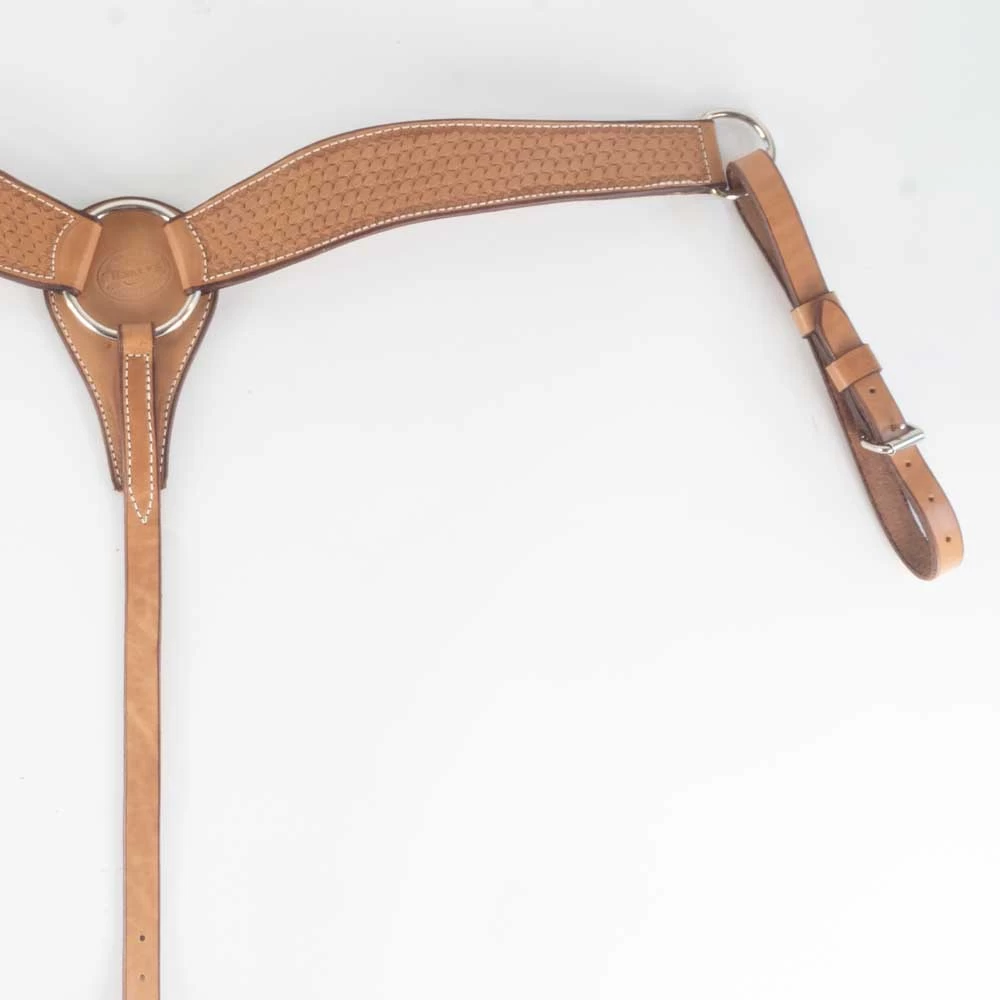 2.5″ wide leather breast collar with basketweave tooling and stainless hardware. Made in Mexico for Teskey’s Saddle Shop.
