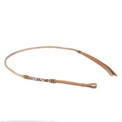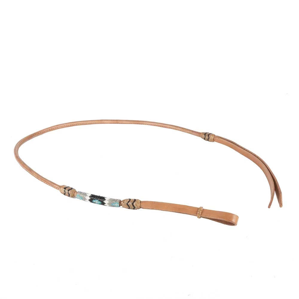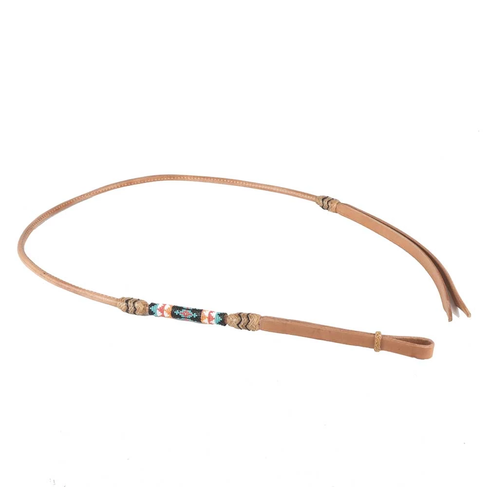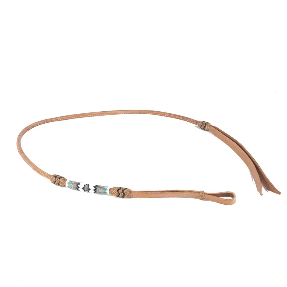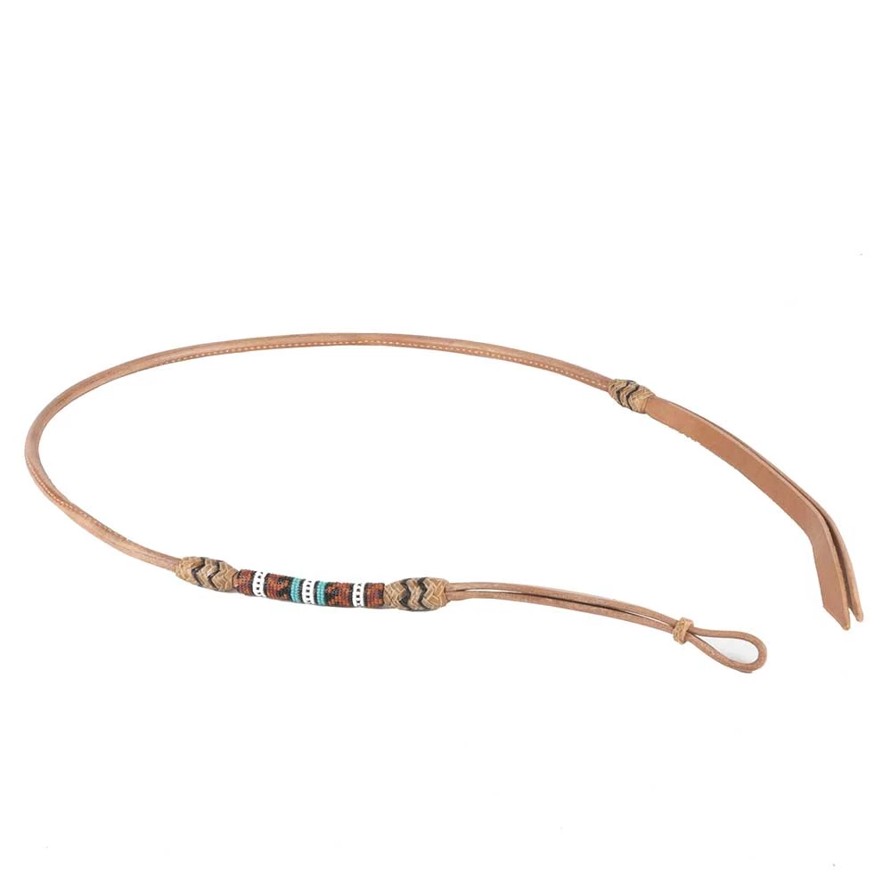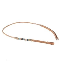 This Teskey’s over-n-under is 56″ long and is a light oil. There is rawhide above the popper and on both sides of the beads. Available colors are rust/black/turquoise, maroon/turquoise/white, silver/black/turquoise, black/pink/turquoise, silver/white/turquoise and white/turquoise/coral. Handmade