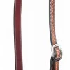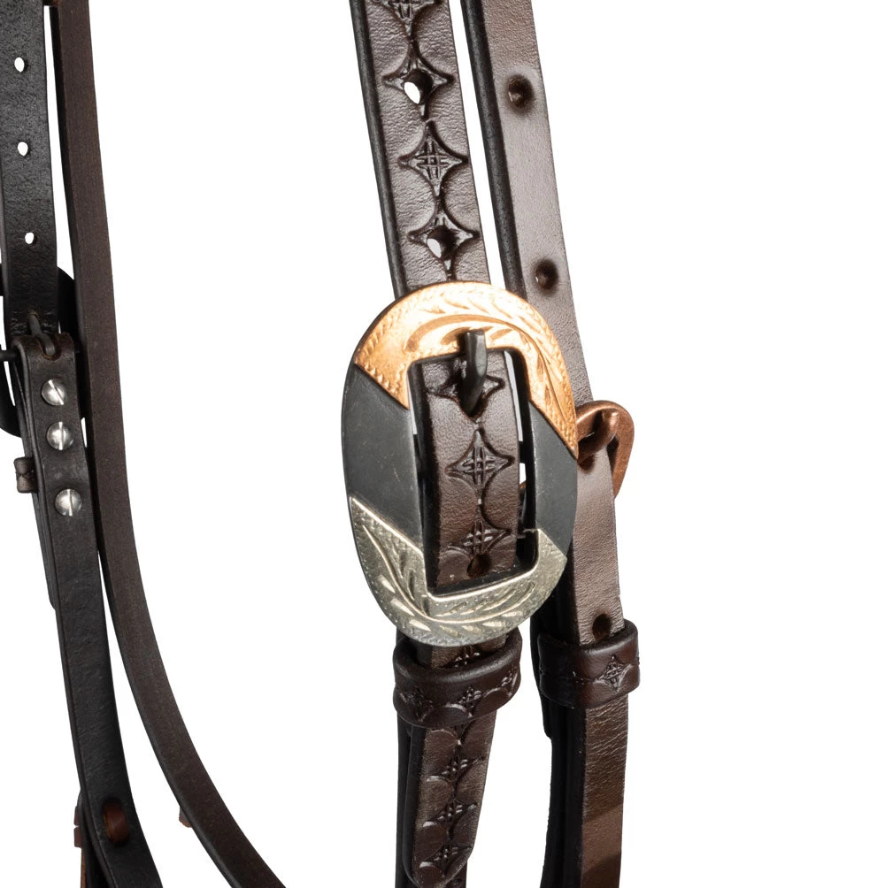 Diamond stamping on browband and cheek pieces, double rust buckles feature copper and silver accents, tie bit ends.