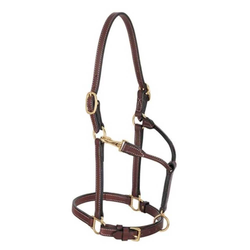 This doubled and stitched mahogany bridle leather 3/4″ halter has smoothed and darkened leather edges, double crown buckles and a rolled and formed throat latch. Non-rust solid brass hardware. Handcrafted in the United States.