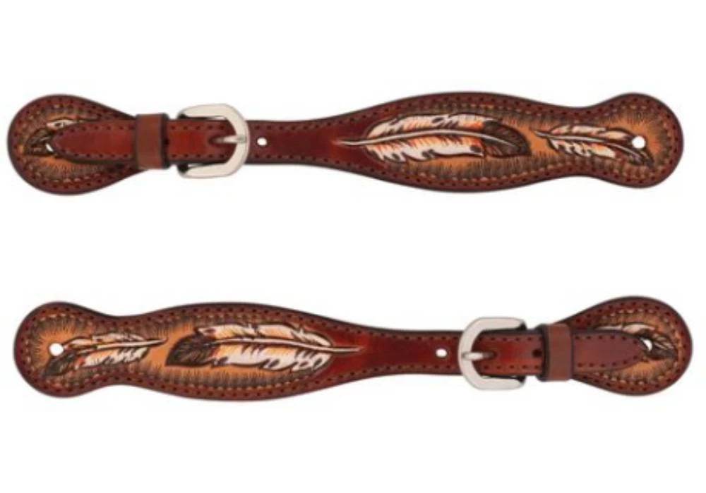 - Chestnut leather with a carved feather design featuring hand painted accents