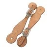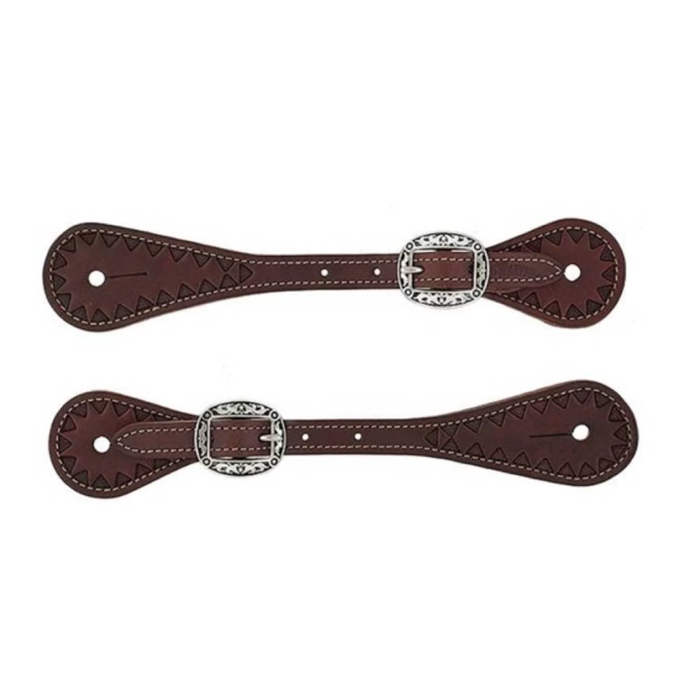 Special details take these spur straps to the next level. Handcrafted from chestnut skirting leather featuring a triangle hand tooled border and floral engraved buckles with black accents